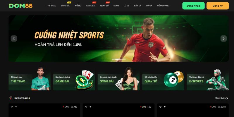 - Đa dạng trò chơi: DOM88 cung cấp hơn 200 sản phẩm đầy đủ thể loại từ casino trực tiếp với các dealer xinh đẹp, cá cược thể thao với tỷ lệ kèo nhà cái cạnh tranh, đến xổ số và slot game với đồ họa sống động.